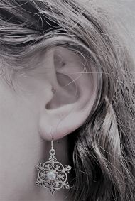 Detailed sterling silver snowflake earrings are highlighted by sapphire colored Swarovski crystals. Mounted on our foldover snow crystal cards. Sterling silver french earwires. Actual length of snowflake, 1"