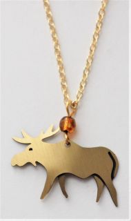 Our brushed brass moose pendant hangs from a 16 inch gold fill chain. Made in U.S.A.