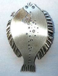 Sterling silver plate flatfish pin is Semaki & Bird's exclusive design. Actual size 2 inches from tip to tail. Crafted in U.S.A.