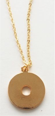 14k gold plate circle necklace is mounted on our exclusive Abstracts cards. 3/4" diameter pendant hangs from 16 inch gold fill chain. Semaki & Bird exclusive. Made in U.S.A.