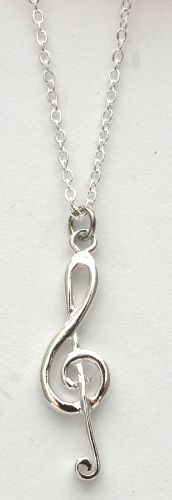 Sterling silver plate G-Clef Pendant on 16 inch sterling silver plate chain. Pendant length 1 1/4 inch. Educational message about music on the back of our tent card.