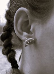 Sterling silver plate Salmon Dangle earrings mounted on our exclusive Alaska tent Natural History cards. Actual length 5/8" Educational information on back of card. Semaki & Bird exclusive. Made in USA.