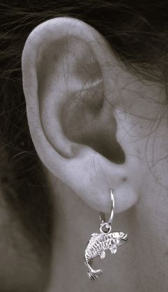 Gold Salmon dangle from our 14k gold over sterling silver hoops. Our salmon earrings are mounted on our exclusive tent salmon Natural History cards. Salmon length 5/8 inches, hoop diameter 1/2 inch. Educational information about salmon on back of card. Semaki & Bird exclusive. Made in U.S.A.