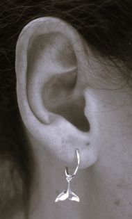14k gold over sterling silver whale tails dangle from our 14k gold over sterling silver hoops. Whale tail earrings are mounted on our exclusive tent whale Natural History cards. Whale tail 3/8 inches, hoop diameter 1/2 inch. Educational information about whales on back of card. Semaki & Bird exclusive. Made in U.S.A.