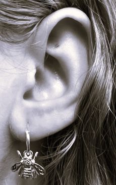 Sterling silver plated Bees dangle from sterling silver hoops. Bee wing length 5/8 inch, hoop diameter 1/2 inch. Mounted on tent Natural History cards with educational information on back of card. Semaki & Bird exclusive. Made in U.S.A.