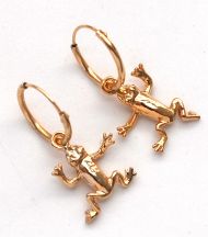 14k gold over sterling silver frogs dangle from our 14k gold over sterling silver hoops. Our frog earrings are mounted on our exclusive tent frog Natural History cards. Frog 1/2 inch long, hoop diameter 1/2 inch. Educational information about frogs on back of card. Semaki & Bird exclusive.