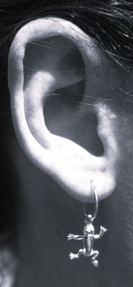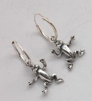 Sterling silver frogs dangle from our sterling silver hoops. Our frog earrings are mounted on our exclusive tent frog Natural History cards. Frog 1/2 inch long, hoop diameter 1/2 inch. Educational information about frogs on back of card. Semaki & Bird exclusive.