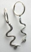 Sterling silver snakes dangle from our sterling silver hoops. Our snake earrings are mounted on our exclusive tent snake Natural History cards. Snake 1 inch long, hoop diameter 1/2 inch. Educational information about snakes on back of card. Semaki & Bird exclusive.