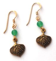 14k gold plate Aspen Leaf earrings. 14k gold over sterling silver ear wires. Wired with assorted semi-precious accent beads. Mounted on card with species and common name of the aspen. Dangle length 1 1/2 inches. Made in U.S.A. Semaki & Bird exclusive.
