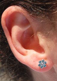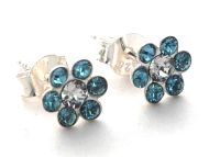 Aquamarine Swarovski crystal and sterling silver stud earrings mounted on artistic card with the natural history of Alaska's state flower on the back.