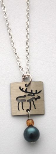 Our moose pendant hangs from a 16" sterling silver chain. Semi-precious stones and accent beads. Carded on "Alaska Petroglyph" card. Semaki & Bird exclusive. Crafted in U.S.A.