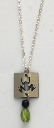 Our sterling silver frog pendant hangs from a 16" sterling chain. Each necklace unique with semi-precious stones and accent beads. Crafted in U.S.A. (sterling silver element 1/2")